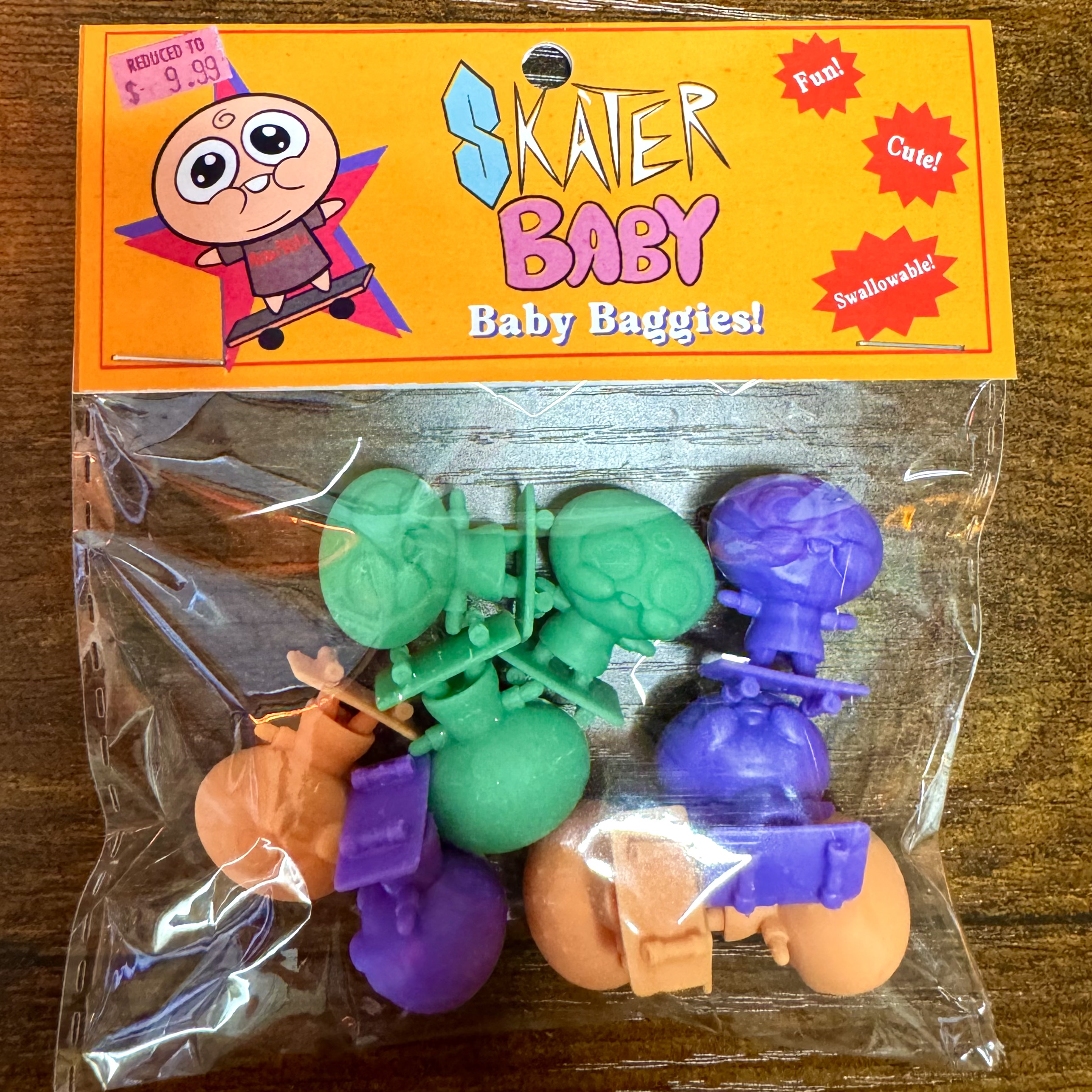 Originally from 1972, the Skater Baby Baby Baggies were a popular convenience store toy, giving children a bag of colorful plastic versions of their favorite cartoon character, Skater Baby. Years later they were taken off the market as a choking hazard.